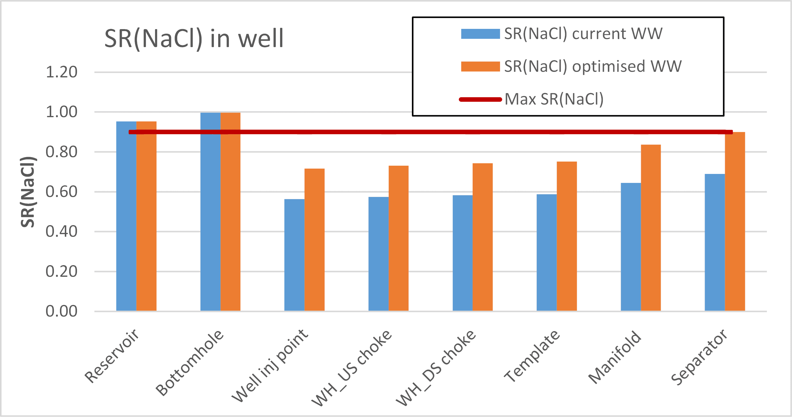 The graph shows calculated SR(NaCl) with current wash water injection (blue bars) and shows that after the injection point, SR(NaCl) is well below the maximum limit. The wash water injection rate can therefore be reduced from the current 23 m3/d down to 13.4 m3/d and this will increase the SR(NaCl), but not above the limit (orange bars). This will save about 10 m3/d of injection water.