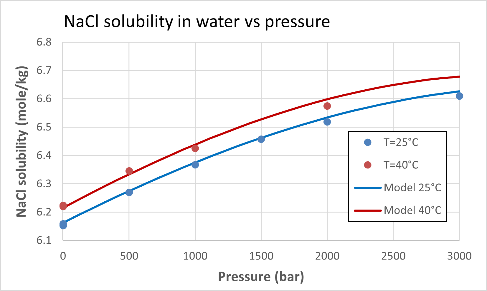 Solubility of halite vs temperature and pressure – experimental data and ScaleSim model.