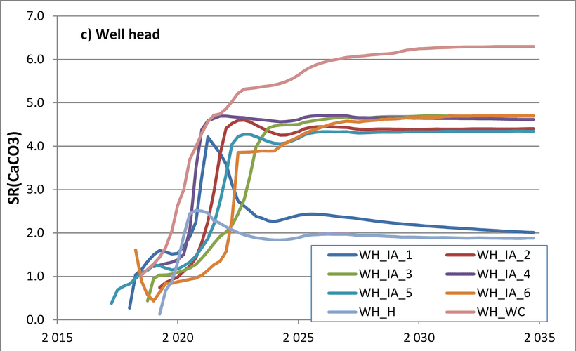 Variation in scale potential for CaCO3 at the wellhead for several wells as function of time (years). Simulations show that some of the wells will have a rapid increase in scale potential after water breakthrough.