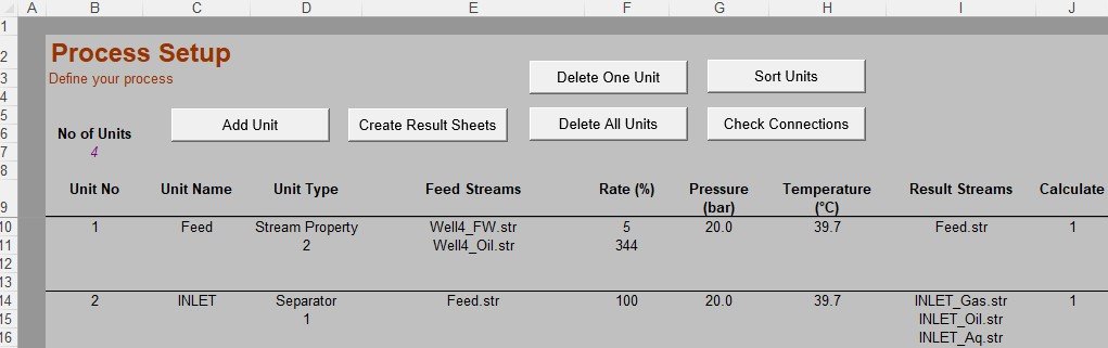 The process setup is then written into an Excel sheet that defines each unit in the process. The setup is very flexible, and you can easily modify all input data such as feed streams, pressures, temperatures, and flowrates. All the input data, such as pressures, temperatures, and flow rates, can also be set by linking the input cells to other cells in the Excel workbook. In this way, you can extract input data from a production profile and easily run through many different cases.