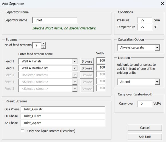 Wizards help you to set up the process by adding one unit at a time. Choose a name of the unit and select feed stream(s) to the unit from available streams in the project. Set pressure and temperature, and add the unit.