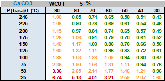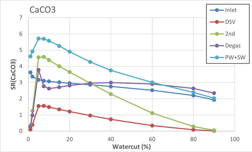 Variation in scale potential for CaCO3 at different locations in a topside process when water cut is varied.