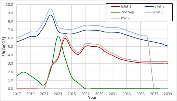 Varying CaCO3 scale risk in a topside process over time – simulations based on expected production profile and topside conditions.