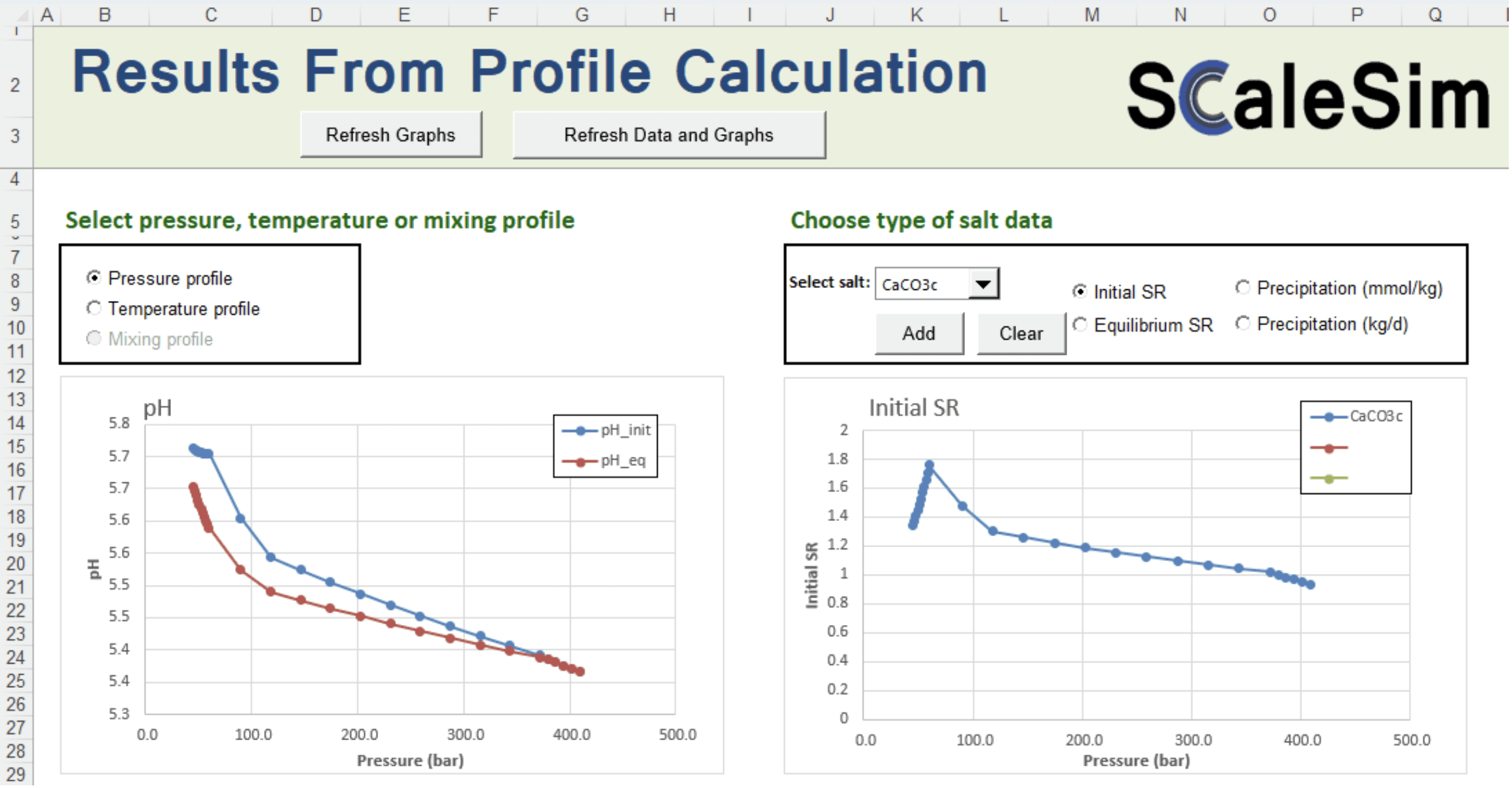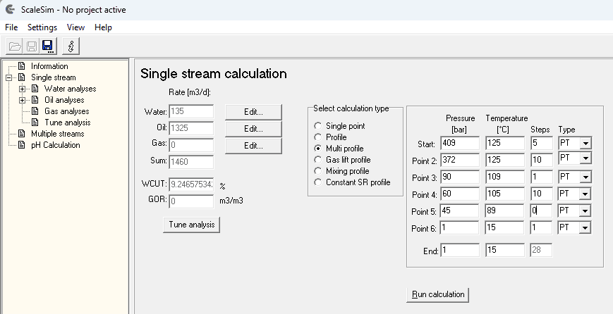 Profiles – Automatically run pressure and/or temperature profiles from start conditions to end conditions. Both P and T can be varied simultaneously. A typical example is to evaluate the risk of CaCO₃ scale when pressure is reduced.
