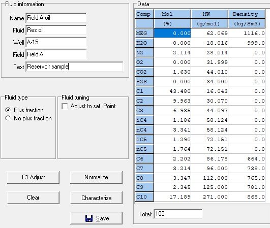 After entering an oil or gas analysis, ScaleSim will automatically calculate several properties, such as density and GOR. Inside the oil analysis window, there are also options for automatically adjustment of the fluid input to match a saturation point or a given GOR.