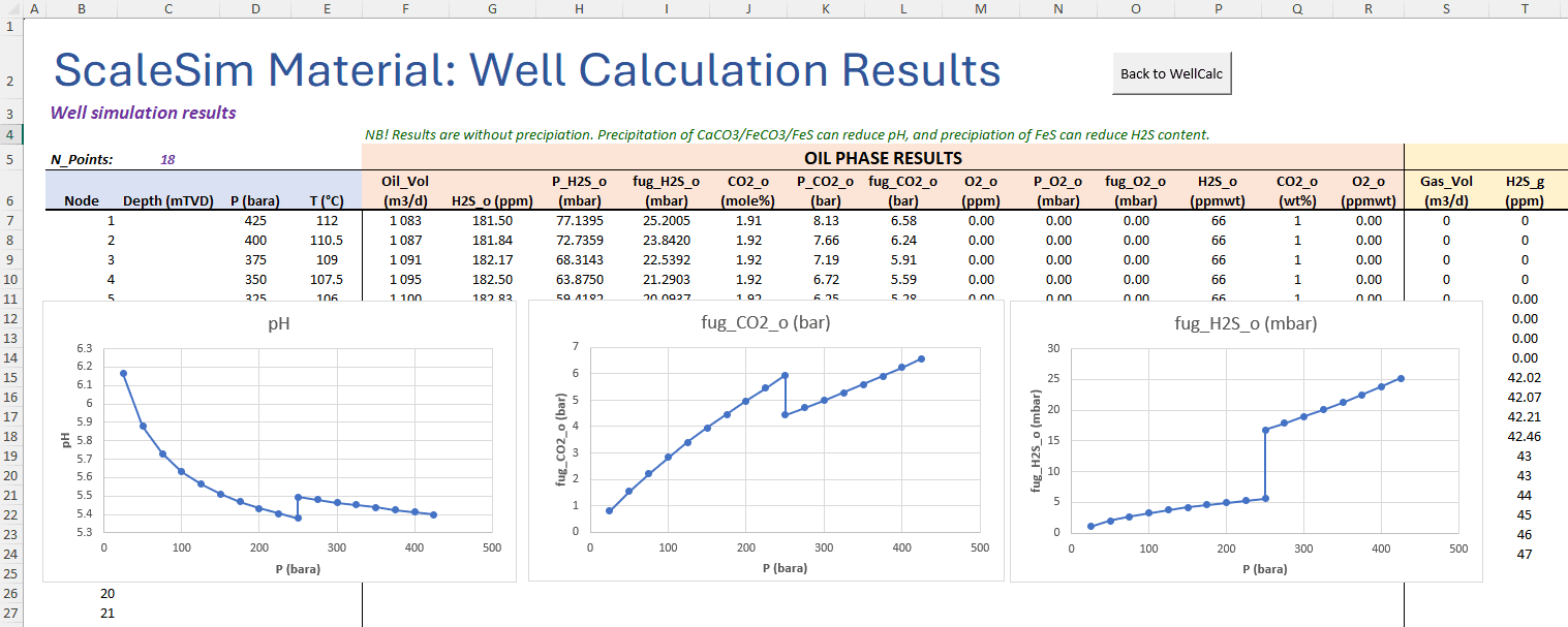 A calculation takes less than a second, and all results are shown in a separate worksheet. The picture below shows the first part showing results for the oil phase. The same data are also given for the gas and the water phase. For the water phase, you will also get information such as pH, chloride concentration, organic acids etc. There is also an automatic plotting section where you can easily generate plots. You may of course also generate you own plots, after all, this is Excel and all the Excel functionality is available!